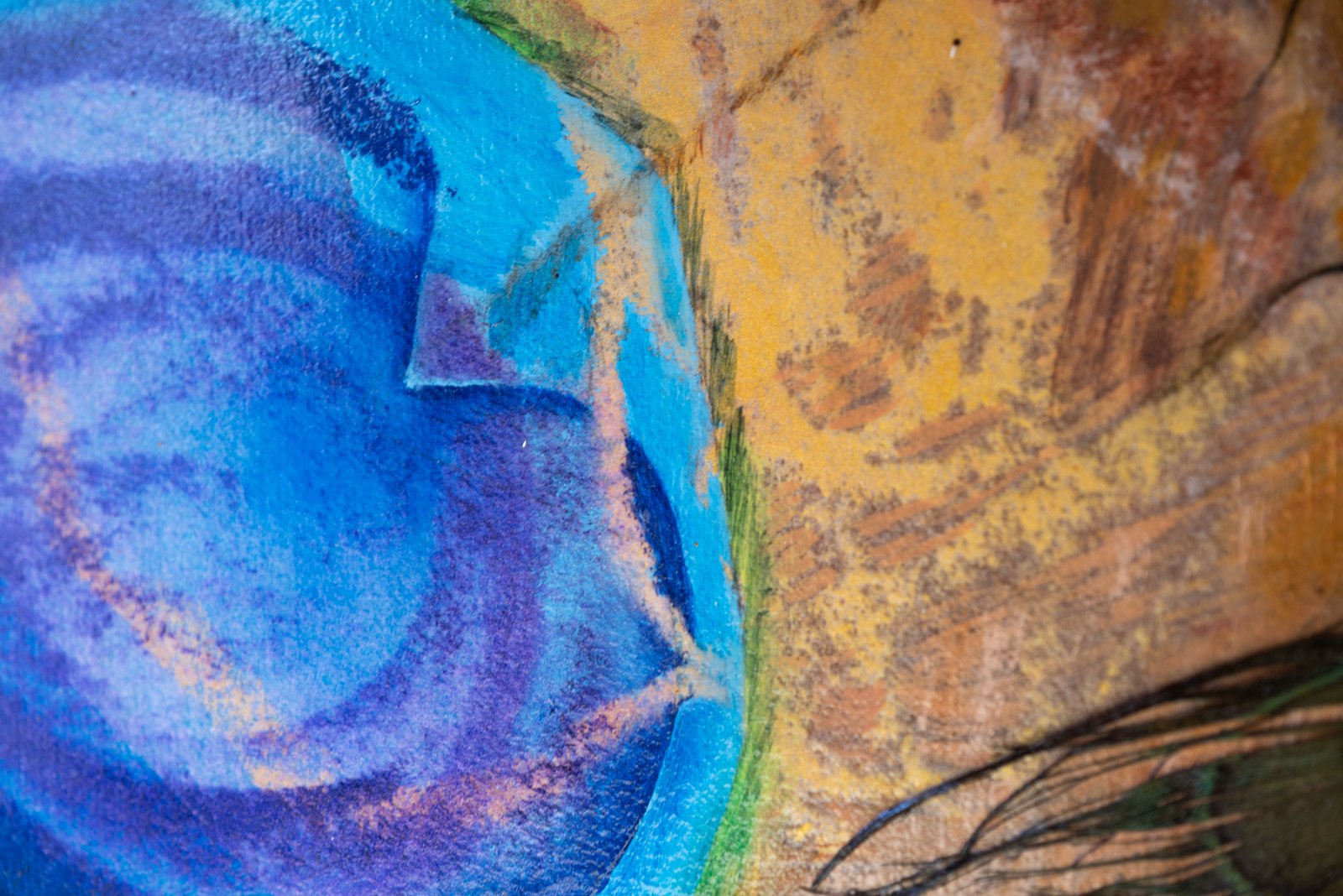(Detail) Acrylic and Peacock Feathers on Linen Tempera Stick on Tea Paper 12 x 16 inches 2025