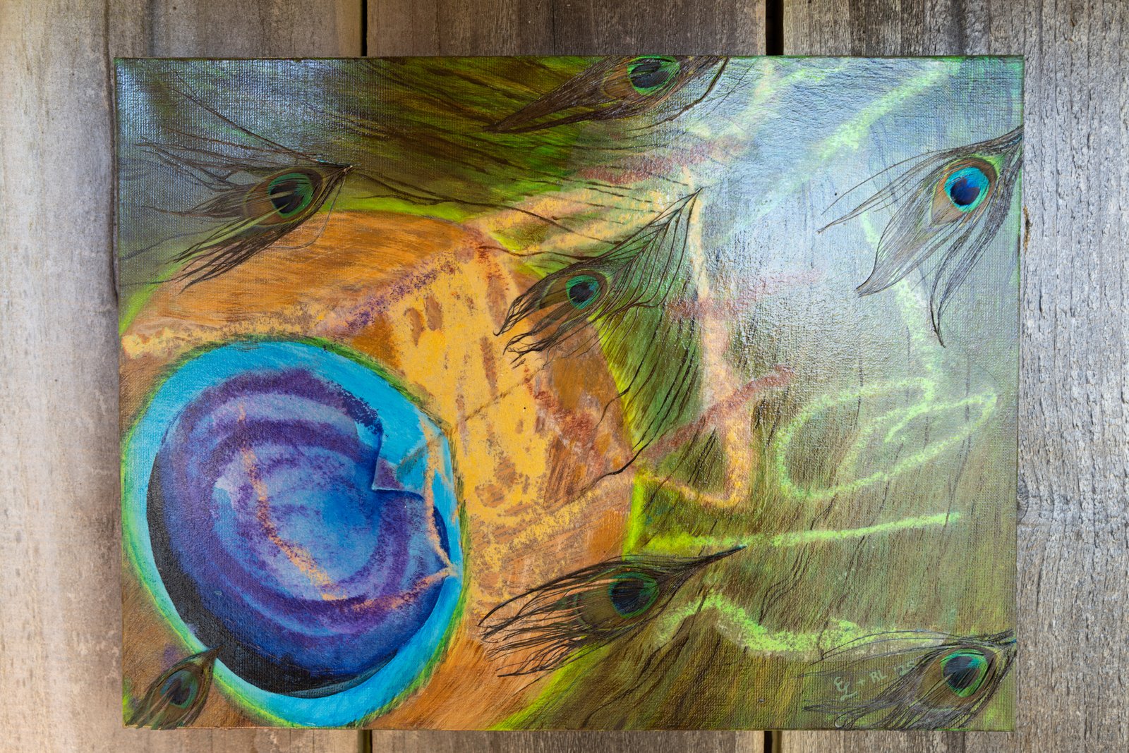 (Detail) Acrylic and Peacock Feathers on Linen Tempera Stick on Tea Paper 12 x 16 inches 2025